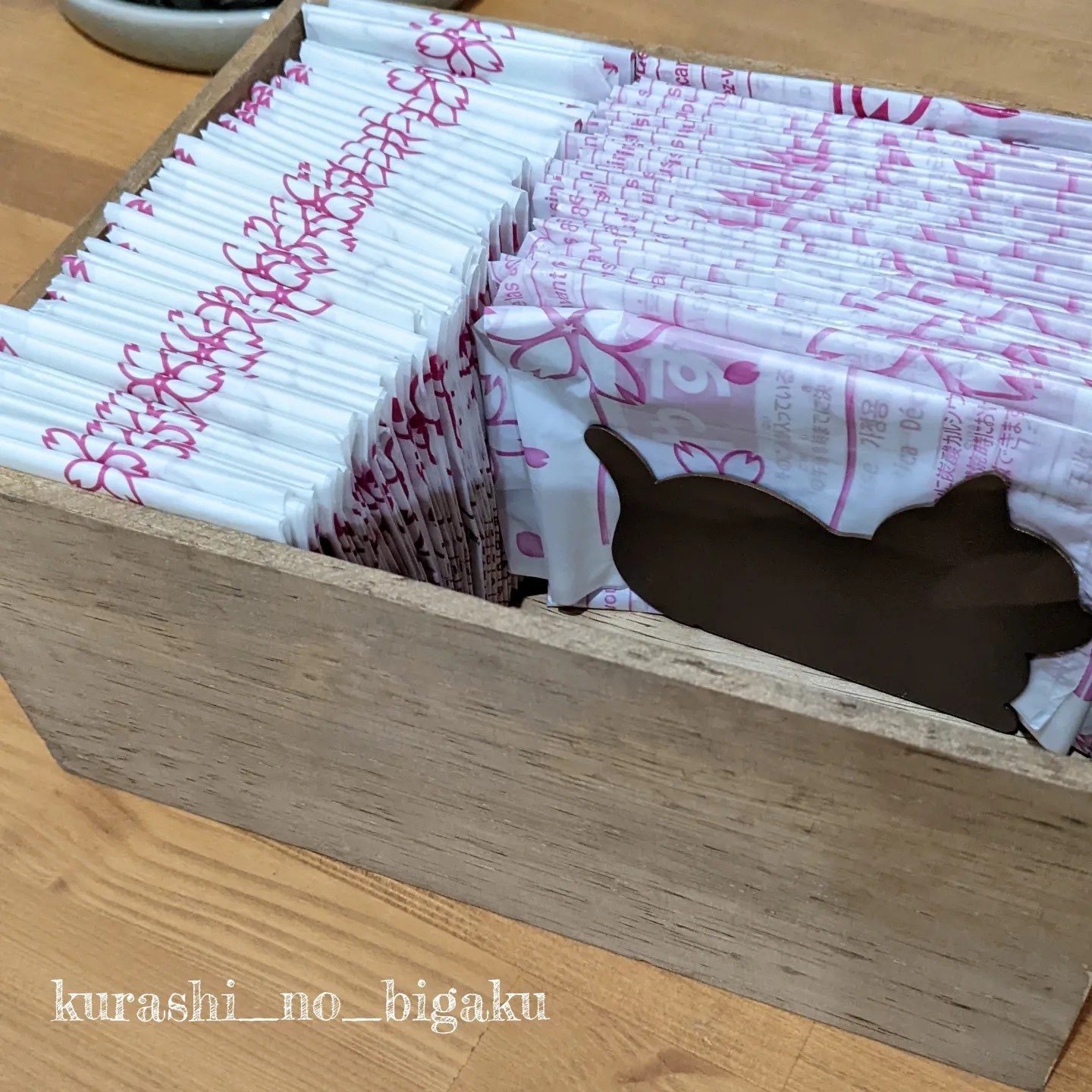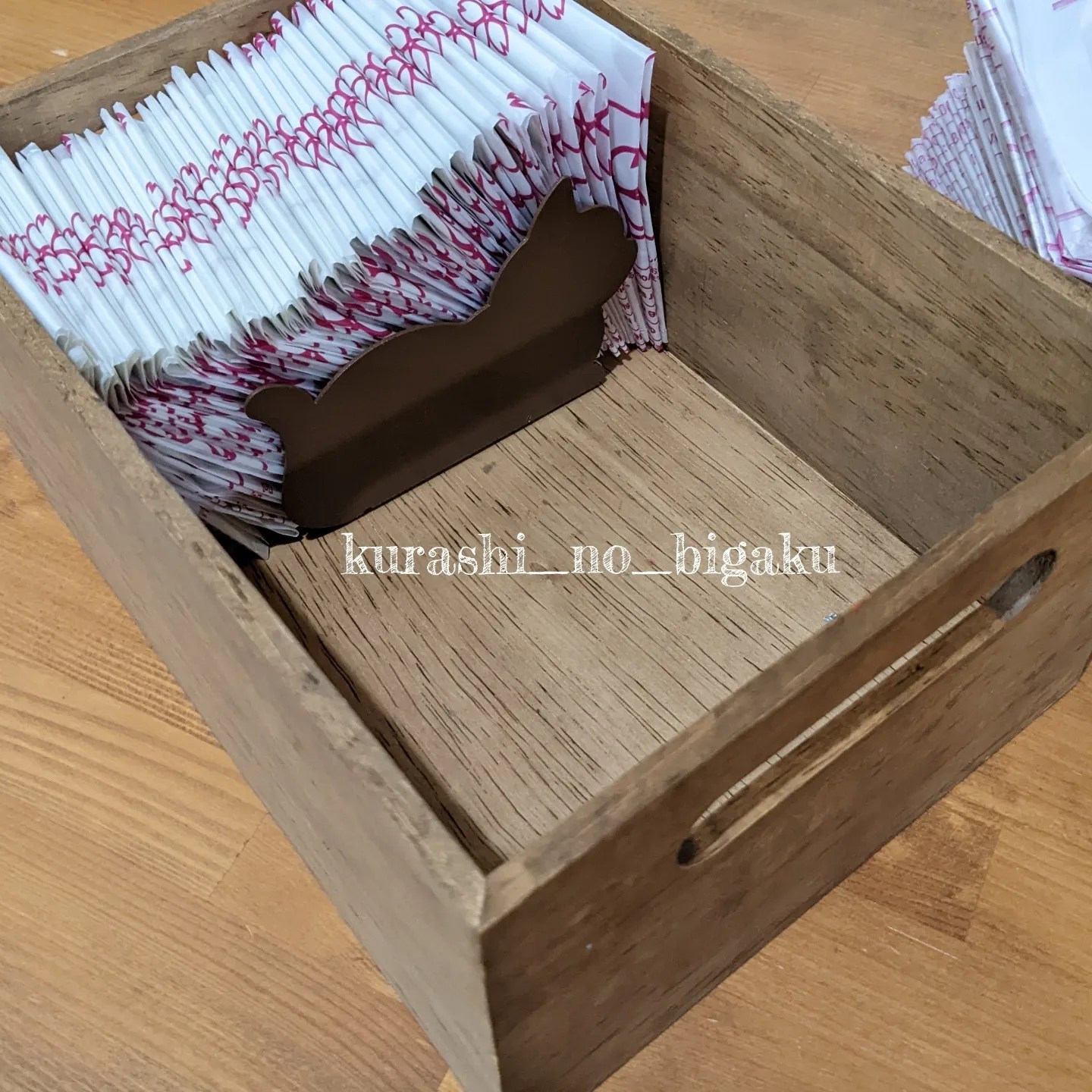 これまで買い置きスポンジ類の収納としていた マーチソンフームの空き木箱と