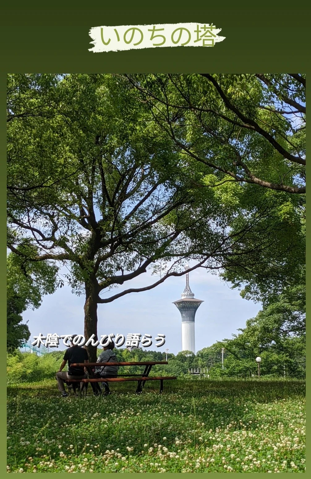 いのちの塔を眺められる木陰で 語らう年配のおふたりの姿。